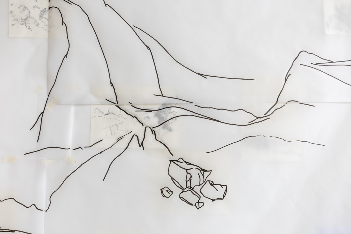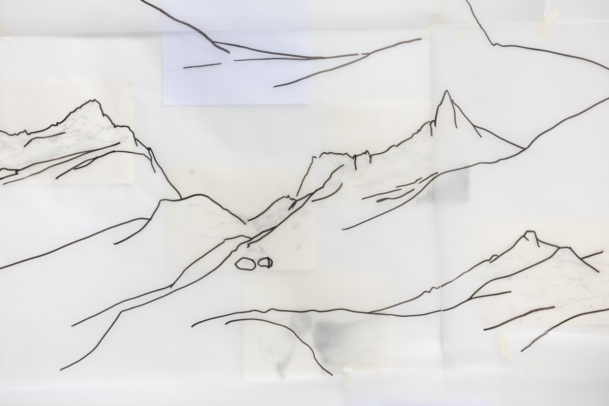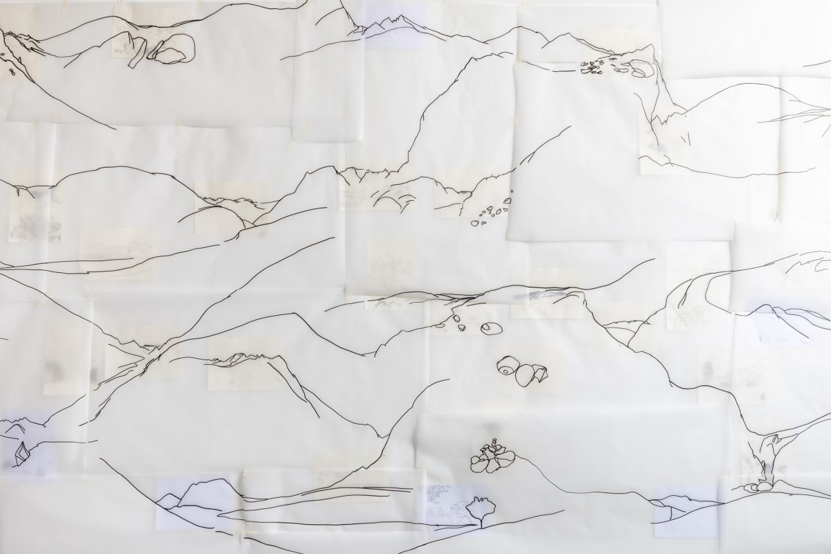 Installation, dessins sur papier A4 et sur calques, 260 cm x 940 cm, 2025, atelier. Photographie ©Jörg Brockmann