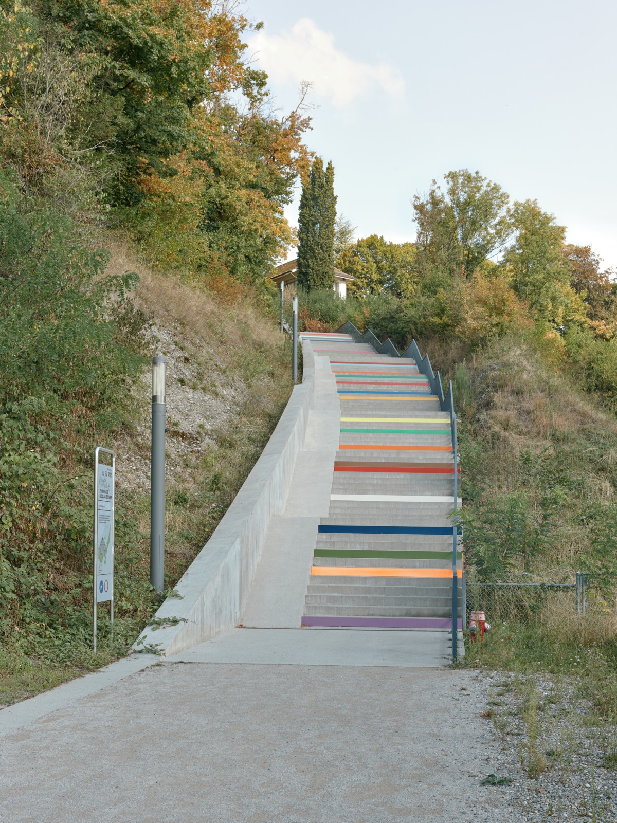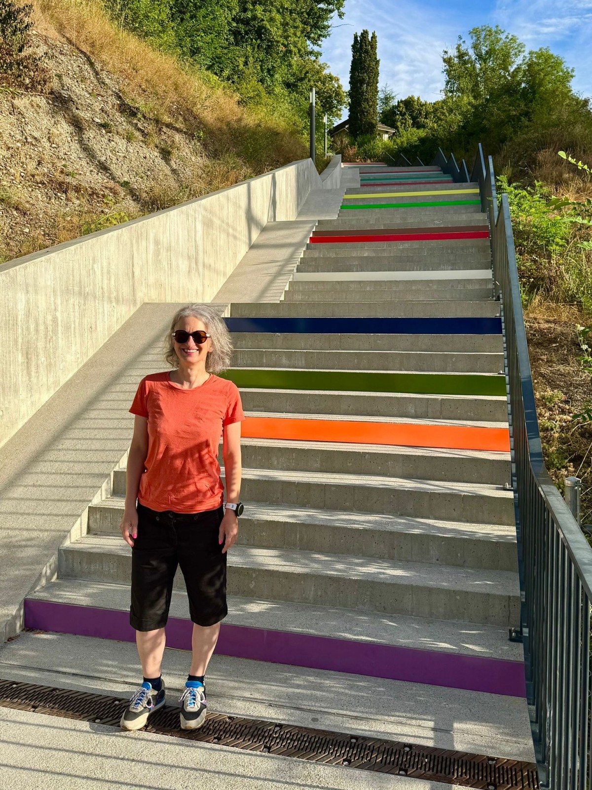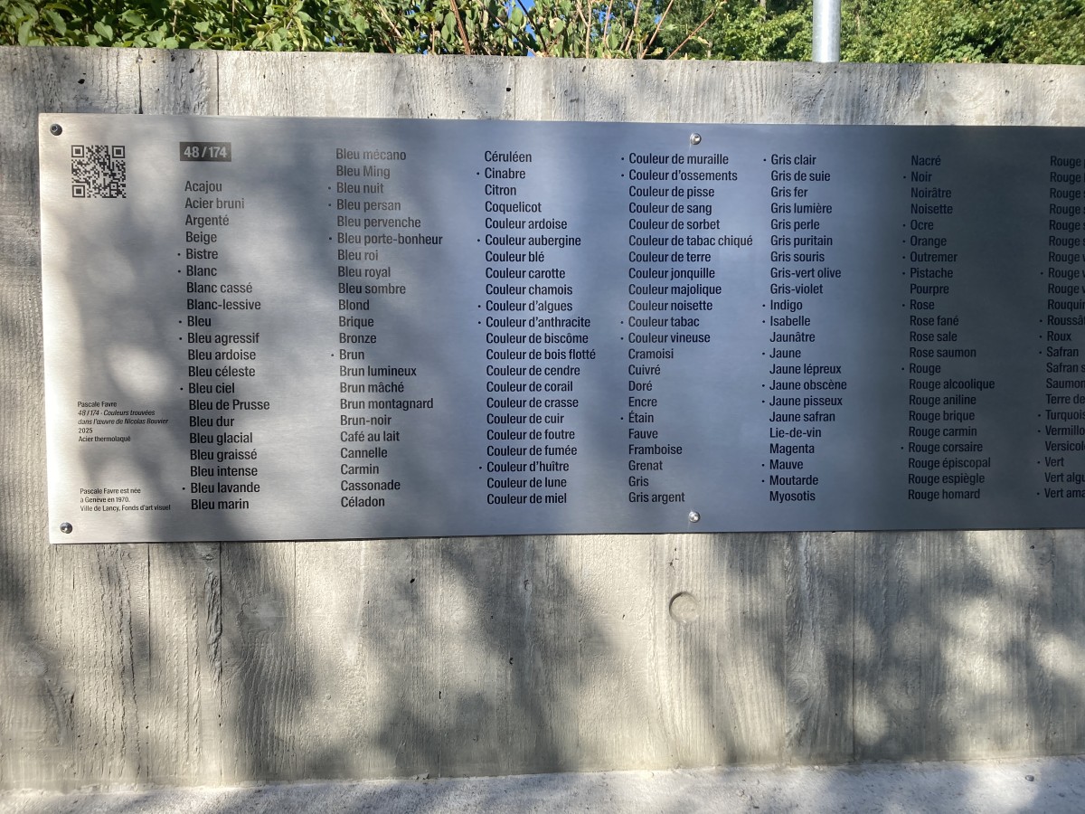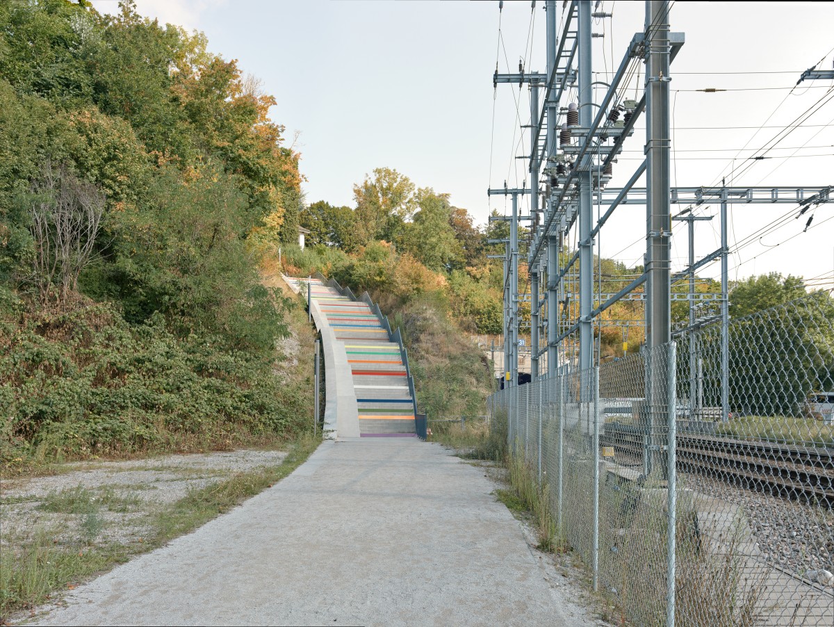 L’installation sur l’escalier monumental qui mène à la promenade Nicolas Bouvier depuis Lancy Pont-Rouge se compose de 48 plaques en métal thermolaquées et collées contre certaines contremarches. Au sommet de l’escalier une liste imprimée sur acier brossé fait voir toutes les couleurs trouvées dans l’œuvre et s’accompagne d’un QR code d'un site où 174 carrés de couleurs découvrent une citation choisie dans l’œuvre de Nicolas Bouvier.