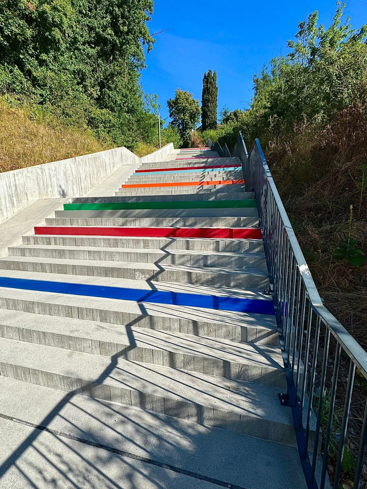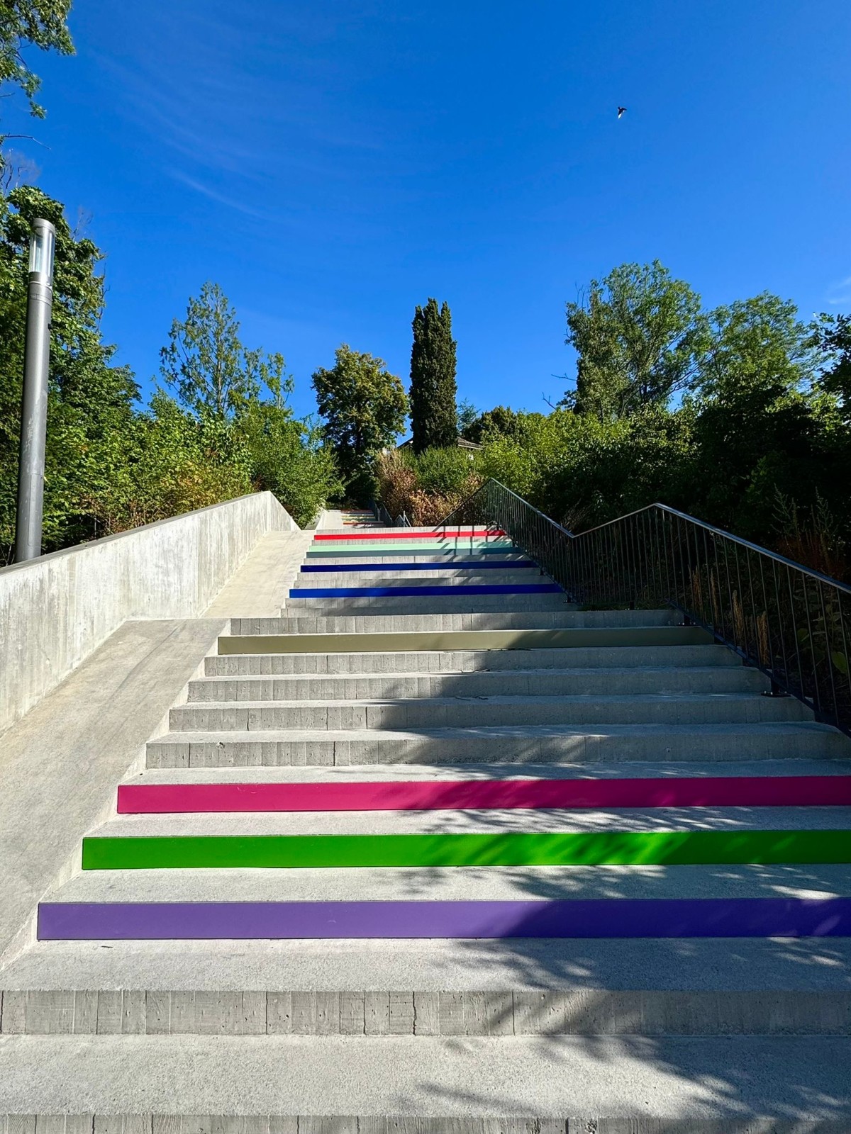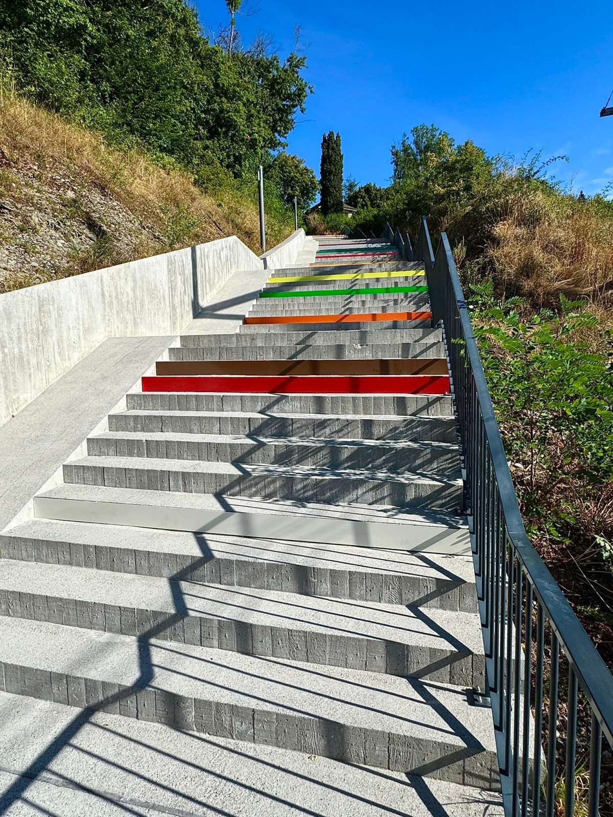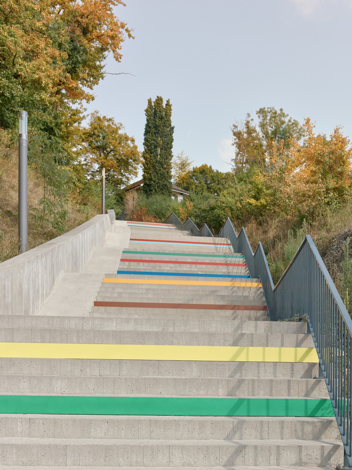L’installation sur l’escalier monumental qui mène à la promenade Nicolas Bouvier depuis Lancy Pont-Rouge se compose de 48 plaques en métal thermolaquées et collées contre certaines contremarches. Au sommet de l’escalier une liste imprimée sur acier brossé fait voir toutes les couleurs trouvées dans l’œuvre et s’accompagne d’un QR code d'un site où 174 carrés de couleurs découvrent une citation choisie dans l’œuvre de Nicolas Bouvier.