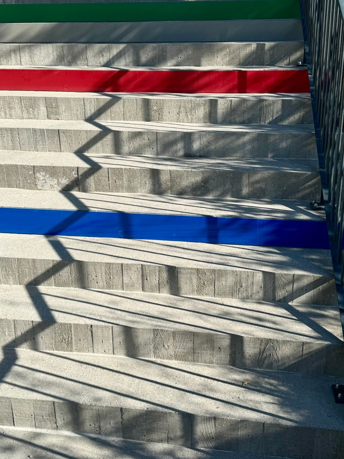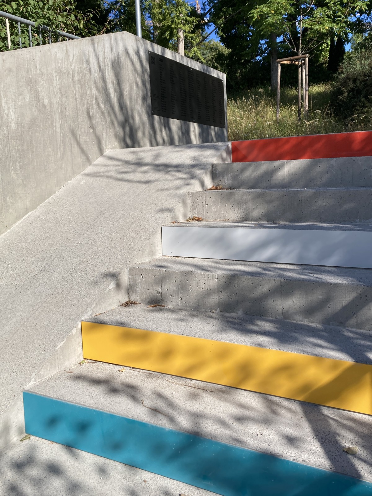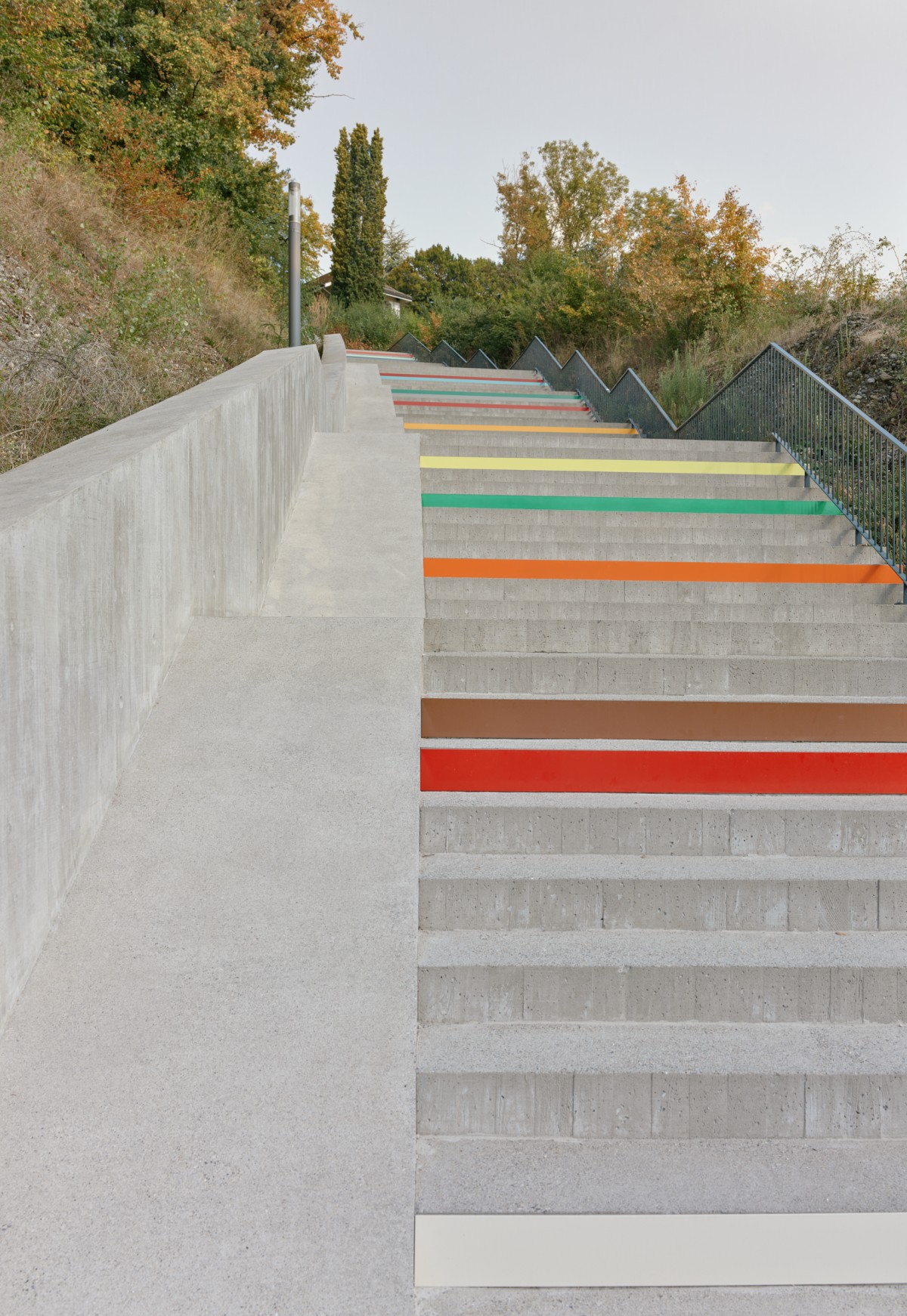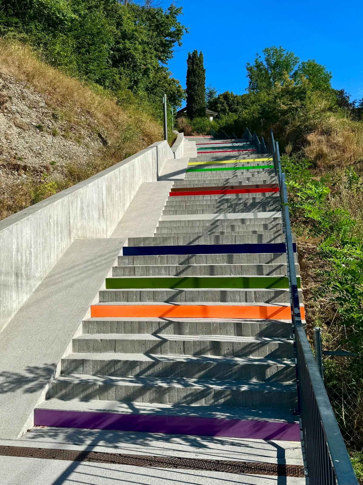 L’installation sur l’escalier monumental qui mène à la promenade Nicolas Bouvier depuis Lancy Pont-Rouge se compose de 48 plaques en métal thermolaquées et collées contre certaines contremarches. Au sommet de l’escalier une liste imprimée sur acier brossé fait voir toutes les couleurs trouvées dans l’œuvre et s’accompagne d’un QR code d'un site où 174 carrés de couleurs découvrent une citation choisie dans l’œuvre de Nicolas Bouvier.